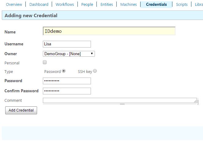 - You select either a password or an SSH key for a credential, depending on what you want to use.